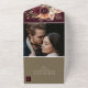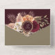 Esta rústica invitación de boda todo en uno presenta un impresionante arreglo floral de flores de color burdeos, melocotón y marfil con hierba pampas y follaje, perfecto para bodas de otoño o inspiradas en boho. El diseño plegable incluye una respuesta incorporada y una foto personalizada y la dirección de devolución en la solapa trasera. Una opción romántica y ecológica para parejas que buscan tanto estilo como comodidad.