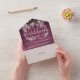 Todo en una invitación a la boda con luces de cuerda de bonito, guirnaldas florales hechas a mano y tipografía de moda sobre un fondo rústico de paneles de madera roja borgoña. La invitación incluye una tarjeta RSVP perforada que puede ser dirigida individualmente o dejada en blanco para que pueda escribir a mano los detalles de la dirección de su invitado. Diseñado por Thisisnotme©