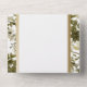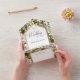 DISPONIBLE CON O SIN CÓDIGO QR O OPCIONES DE SELECCIÓN DE CENAS. Este diseño presenta un fondo de diferentes tipos de vegetación botánica. El área de texto blanco está enmarcada en un falso Relieve metalizado de oro. Un monograma con la primera inicial de la novia y el novio en la solapa exterior lo completa. Creado por Simply Farmhouse Press.