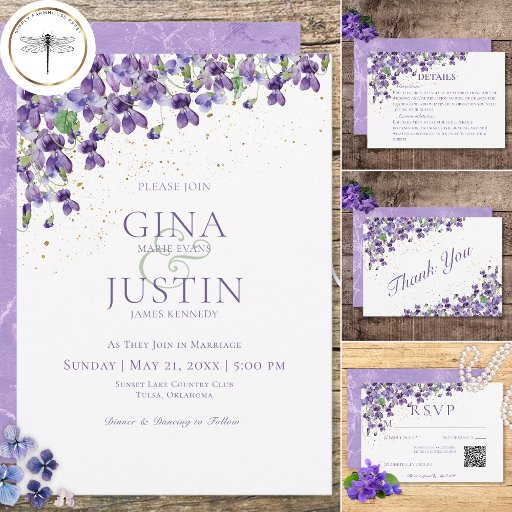 TAMBIÉN ESTÁ DISPONIBLE CON UN CÓDIGO QR A ESCALAR. Invite a sus invitados a una celebración bañada en elegancia etérea. Nuestra invitación a la boda acuarela incluye un cúmulo de delicados violetas, pintadas a mano con la más suave sombra de violeta, adornando la esquina superior. Un toque de magia etérea se añade con una rociada de polvo de oro falso brillando entre las flores. El fondo blanco puro permite que tu texto, también un violeta suave, destaque maravillosamente. Esta encantadora suite crea un ambiente atemporal y romántico que refleja perfectamente el comienzo de tu vida. Creado por Simply Farmhouse Press.