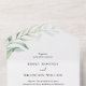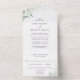 Elegante invitación botánica All In One Wedding con un diseño sencillo con una pizca de vegetación eucaliptica en un bonito tono verde salado en la esquina superior izquierda y esquina inferior derecha. Una elección sencilla y moderna perfecta para un boda de primavera o verano.