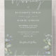 Invitación de boda todo en uno con vegetación floral y tipografía elegante sobre un fondo verde sabio. La invitación incluye una tarjeta RSVP perforada que incluye el código QR de su sitio web boda. Diseñado por Thisisnotme©