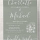 Todo en una invitación de boda con luces de cuerdas de bonito, tarros de albañil, nombres de estilo de firma y tipografía de moda en un fondo verde sabio. La invitación incluye una tarjeta RSVP perforada con un código QR. Diseñado por Thisisnotme©