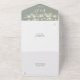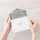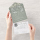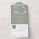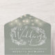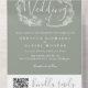 Toda en una invitación de boda con luces de cuerda de bonito, guirnaldas florales dibujadas a mano y tipografía de moda en un sabio fondo verde. La invitación incluye una tarjeta RSVP perforada con el código QR de su sitio web boda y detalles. Diseñado por Thisisnotme©