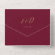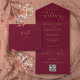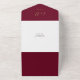Toda en una invitación a una boda de color burdeos y oro con tipografía de escritura de corazones elegantes e iniciales de monograma. La invitación incluye una tarjeta RSVP perforada con su código QR boda personalizado. Diseñado por Thisisnotme©