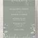 Invitación floral de bodas de vegetación todo en uno con tipografía de escritura de corazones elegantes y iniciales de monograma sobre un fondo verde sabio. La invitación incluye una tarjeta RSVP perforada que incluye el código QR de su sitio web boda. Diseñado por Thisisnotme©