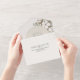Elegante invitación a bodas de invierno con una vegetación de color agua verde con flores blancas y poinsettia alrededor de un marco oval de marfil, crema y taupe claro. Esta invitación sustentable "todo en uno" te ahorraría dinero, no hay necesidad de incluir sobres RSVP, tus invitados desgarrarán el último panel y te lo enviarán de vuelta como postal. ¿Necesita piezas que no sean las de la colección? Por favor, póngase en contacto conmigo usando el botón de contacto de abajo.