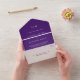Plantilla única de invitación de boda All In One con tarjeta rsvp para una opción conveniente y de bajo costo para parejas con experiencia en presupuesto. La moderna pero elegante invitación incluye su monograma de dos letras en la parte superior junto con los detalles de su boda en blanco sobre un fondo morado. Una moda y un diseño de diseño, ideal para una pareja minimalista.