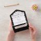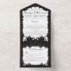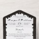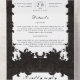 Todo en una invitación a la boda triplicada con un diseño victoriano marrón oscuro con flores ornamentales. Invitación a la boda, tarjeta rsvp con opciones de comida, detalles y combinación de sobres.