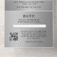 Plata, gris, código QR, RSVP, brillo, Boda Todo en una sola invitación. Tres veces elegantes, modas, invitaciones nupciales únicas y modernas. Personalizar con sus detalles. Orden a tiempo para evitar una decepción.