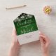 Toda en una invitación a la boda con luces de cuerda de bonito, tarros de albañil, nombres de estilo y tipografía de moda en un rústico fondo de madera verde esmeralda. La invitación incluye una tarjeta RSVP perforada con opción de comida. Diseñado por Thisisnotme©