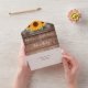 Todo en una invitación a la boda con girasoles de bonito, luces de cuerdas, tarros de albañil, nombres de estilo característico y tipografía de moda sobre un fondo rústico de madera. La invitación incluye una tarjeta RSVP perforada con opción de comida. Diseñado por Thisisnotme©