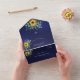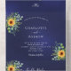 Un fondo azul marino adornado con girasoles acuáticos, vegetación eucaliptica. El color azul es desigual. Personalice y agregue sus nombres, monogramas y detalles del boda.