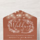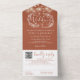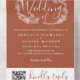 Todo en una invitación de boda con luces de cuerdas de bonito, guirnaldas florales hechas a mano y tipografía de moda en un fondo de terracota. La invitación incluye una tarjeta RSVP perforada con el código QR de su sitio web boda y detalles. Diseñado por Thisisnotme©