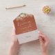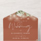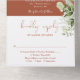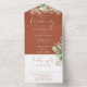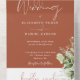 Todo en una invitación a la boda de terracota con luces de cuerda de bonito, vegetación floral y tipografía elegante. La invitación incluye una tarjeta RSVP perforada que puede ser dirigida individualmente o dejada en blanco para que pueda escribir a mano los detalles de la dirección de su invitado. Diseñado por Thisisnotme©