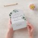 Esta invitación All in One que incluye RSVP y Dirección Return incluye varios tallos eucaliptos con hojas y tipografía de guiones. La invitación también es personalizable. Simplemente inserte los datos de su boda donde dice, Personalice esta plantilla. He marcado la plantilla necesaria para ayudarle en esta personalización.