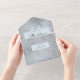 Su día de boda es un evento único en la vida, y merece una invitación que refleje la historia de amor única y moderna que usted comparte. Este diseño de copos de nieve azul hielo pálido combina la elegancia contemporánea con un toque de magia de invierno, y sienta las bases para una celebración verdaderamente inolvidable. Las invitaciones de boda todo en uno son hermosas y prácticas al combinar la invitación de boda con una postal RSVP fácil de quitar perforada. También son rápidos y fáciles de preparar para el correo. Simplemente dirija la invitación, doble el pliegue trasero y selle con los pegatinas claros incluidos. Una vez que sus invitados reciben la invitación, simplemente rompen la tarjeta RSVP perforada y la tiran por correo. La adición del código QR permite a los clientes acceder fácilmente a la página web de su boda para obtener información, incluyendo detalles de recepción y opciones de cena.