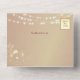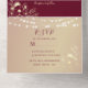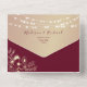 Esta romántica invitación a la boda se caracteriza por sus profundos tonos burdeos, sus suaves acentos florales en oro y sus brillantes lámparas de cuerda, perfectas para un acogedor invierno o un elegante boda nocturno. Con un RSVP integrado y un panel de correo, es una solución práctica y elegante para las parejas que buscan simplificar su suite de papel sin sacrificar la belleza.
