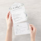Elegante vegetación acuática y floral invitación a la boda todo en uno con RSVP perforado. Ambientalmente amigable ya que no hay necesidad de tarjetas de inserción extra, tarjetas RSVP o incluso sobres, esta invitación lo tiene todo! Posibilidad de añadir detalles de la ceremonia Boda y de la recepción, así como postales RSVP listos para que los huéspedes rellenen y envíen por correo. Diseño con exquisita vegetación y detalles florales en una hermosa mezcla de tonos blancos, azules y verdes. RSVP de vuelta en un polvoriento tono azul. Invitación con instrucciones al sitio web y RSVP con amplia sección para opciones de comida. También está disponible la misma invitación con un diseño central y RSVP diferente. Opción para solicitar invitaciones con el nombre de invitado impreso (o escritura a mano más tarde) en la parte posterior para que pueda enviarlo por correo sin necesidad de sobres, o en su lugar, añadir un mensaje personal o presupuesto si prefiere enviar una tarjeta con un sobre. Un diseño atractivo ideal para una pareja elegante, práctica y ecológica. Parte de nuestra colección "Elegant Bliss" con una variedad de invitaciones coordinadas, inserciones de tarjetas, accesorios de correo, guardar las fechas, tarjetas de agradecimiento y señales de eventos y productos. Visitar la colección completa en: https://www.zazzle.com/collections/elegant_bliss_collection-119067295475874152