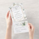 Elegante invitación de boda todo en uno con verde y dorado falso que presenta hojas de acuarela suaves y acentos dorados digitales (diseño gráfico, no lámina de oro real). Coordina con la colección completa Greenery and Gold.