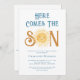 Invite a su familia y amigos a una ducha con temática de sol con esta tierna invitación a los niños soleados para una ducha de bebé. Presenta el texto "Here Comes The Son" en tipografía retro con un bonito sol acuarela amarillo. La parte posterior tiene solicitudes de pañales y libros y un código QR integrado que puede cambiar para vincular directamente a su registro. Personalizable fácil. Acuarela original © Michele Davies.
