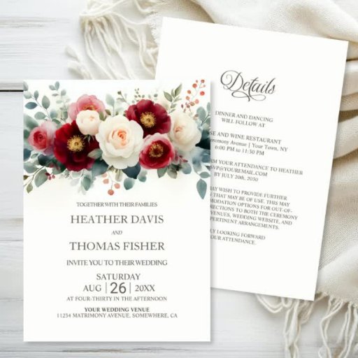 Invite a sus amigos y seres queridos a celebrar su unión con esta invitación de boda floral blanca y borgoña. El texto del personalizable le permite añadir sin esfuerzo los nombres de la novia y del novio, la fecha del boda y los detalles necesarios de su celebración. Diseñado para una pareja de expertos en presupuesto, la ubicación de la recepción, la solicitud de respuesta de RSVP, los detalles del alojamiento y cualquier otra información que sus huéspedes puedan necesitar se pueden incluir en el reverso de esta invitación, ahorrando dinero en papel extra. Hay una variedad de tipos de papel y estilos de esquina disponibles para sus invitaciones únicas, junto con la opción de descargar.