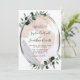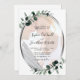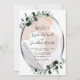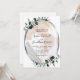 Eucalyptus Photo Silver Metallic Todo en una invitación de boda... Nuestra invitación a la boda fotográfica "All in One" incluye un marco oval metálico plateado adornado con hojas de eucalipto verde salado y esmeralda que bordean una foto de la novia y el novio con un fondo blanco y fresco. Su foto se colocará sobre una capa bajo una transparencia blanca para "atenuar" los colores de alguna manera, de modo que el texto de la parte superior sea legible. La parte posterior de la invitación contiene todos los detalles que normalmente se verán en las tarjetas separadas del paquete boda. En la parte posterior también hay una plantilla de gráfico de código QR que puede reemplazar con su propio código simplemente introduciendo la dirección URL de su sitio web boda en la plantilla de personalización. Su foto, código QR y todo el texto de ejemplo se pueden revisar fácilmente con su propia información en la misma plantilla.