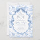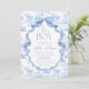 Esta Invitación es una fusión encantadora de elegancia clásica y capricho juguetón. Con un delicado motivo de tela de Jouy en un suave tono azul para bebé, exhibe hermosamente animales de safari de estilo vintage —como elefantes suaves y jirafas grávidas— enclavados entre intrincados elementos florales y botánicos. La delgada gama y la relajante paleta de colores le dan una estética de calidad heirolor, perfecta para una celebración eterna y sentida. Enmarcada con una elegante cinta azul y un arco, y emparejada con una tipografía refinada, esta invitación se siente sofisticada y dulce a la vez. Capta la maravilla de una nueva aventura mientras honra la belleza tradicional, haciendo de ella una encantadora manera de dar la bienvenida a un bebé con calidez y estilo. Elementos coincidentes disponibles.