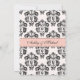 Una elegante y sofisticada invitación de boda con tema francés estilo parisino con un borde floral de damasco antiguo vintage en blanco y negro, un diseño de cinta impresa con tono rosa claro y la Torre Eiffel en ella. Personalízala con los nombres de la novia y el novio en la parte posterior. Diseñado por Chrissy H. Studios, LLC. Todos los derechos reservados.