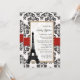 Invitaciones a la ducha de matrimonio con temática francesa, de estilo parisino, alegre y sofisticado, con un antiguo borde floral adamascado blanco y negro vintage, diseño de cinta roja impresa y la Torre Eiffel. Diseñado por Chrissy H. Estudios, LLC.Todos Los Derechos Reservados.
