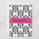 Invitaciones a la ducha de matrimonio temáticas francesa alegre y sofisticadas de estilo parisino, con un antiguo borde floral adamascado blanco y negro vintage, diseño con estampado de cinta de color fucsia y la Torre Eiffel. Diseñado por Chrissy H. Estudios, LLC.Todos Los Derechos Reservados.