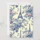 Agrega un toque parisino a tu celebración con esta invitación de baby shower de la Torre Eiffel Toile Francesa. Con un clásico estampado azul de toile de Jouy con flores, mariposas y acentos de la Torre Eiffel, este diseño es perfecto para baby showers elegantes y caprichosas. Puesta en un suave fondo crema y enmarcada con una disposición de texto moderna, es ideal para futuras mamás con estilo. Personaliza fácilmente los detalles de tu evento y elige el acabado de papel que prefieras.