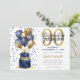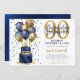 Esta fabulosa invitación a la fiesta sorpresa de la torta azul marino de 90 años de los hombres con una torta azul marino de dos capas y oro con globos azul marino y dorado y el número 90 en oro sería perfecta para celebrar a tu esposo, hermano, papá, amigo, tío, abuelo, bisabuelo. Es tradicional y clásico, fresco, moderno y contemporáneo. La parte de atrás es un Relieve metalizado azul marino de coordinación.