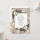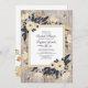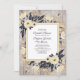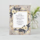 Invitación de boda de madera rústica y botánica con flores y hojas de acuarela en crema y azul marino.