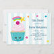 Una invitación a bañarse en una ducha con fondo de rayas azules y blancas. Encendido encima de la superficie, hay una linda tarta con una cara sonriente kawaii. Una cereza en la parte superior también tiene una cara linda. Una estrella fugaz está volando en el aire. Algunas estrellas de colores decoran el diseño.