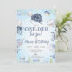 Blue Photo Sea Turtle One-der The Sea 1st Birthday Invitation Sweet under the sea o una de las veces la invitación al primer cumpleaños de un niño con la temática del mar con una gran tortuga azul y otras criaturas marinas y algunas algas. Aparece una foto en la parte de atrás. Todo el texto es editable para que la plantilla se pueda usar para cualquier edad.