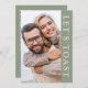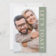 Invitación de la fiesta de compromiso con la foto. Diseño llamativo y audaz, simplemente escrito con "brindemos" junto a la foto de compromiso en el frente. La parte posterior tiene un diseño minimalista y gratuito, con todos los detalles de la celebración. Los colores por defecto son crema de champán y verde sauce, que puede cambiar fácilmente en la herramienta de diseño para que se adapte mejor a su foto o a su tema fiesta. Por favor, navegue por mi colección Invitaciones para participar en la fiesta para obtener más diseños.