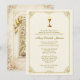 This reverent First Holy Communion invitation is designed in a traditional Catholic style, centered upon the Most Blessed Sacrament. A radiant golden chalice and consecrated Host bearing the sacred IHS monogram are surrounded by delicate floral ornamentation in soft blush and ivory tones, all framed within an elegant arched sanctuary motif and adorned with a flowing gold ribbon.