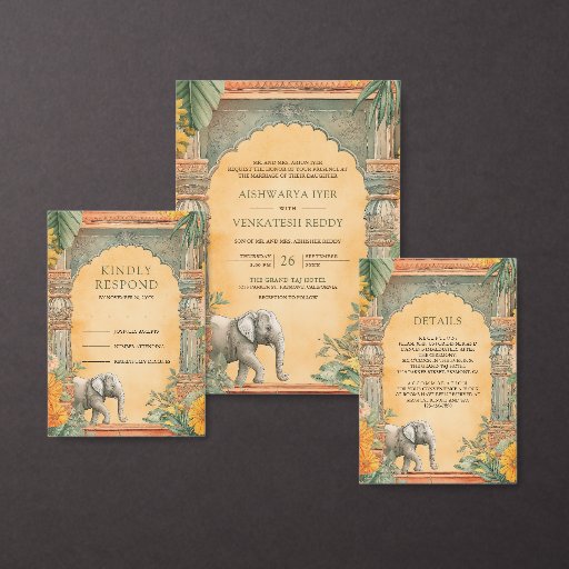 Amaze your guests with this elegant south Indian theme wedding invite featuring beautiful traditional columns and vintage architectural elements decorated with marigold flowers and banana leaves. Customize the QR Code for online RSVP or venue location. Simply add your event details on this easy-to-use template and adorn this card with your favorite photo to make it a one-of-a-kind invitation.