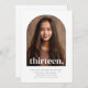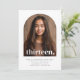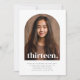 Una simple invitación a los 13 años con tu propia foto en forma de arco y las palabras 'trece' en la parte superior.