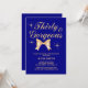 Una elegante invitación de cumpleaños número 30 con una linda cinta de oro y la tipografía moderna "Thirty & Gorgeous", con un fondo azul marino.