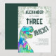 Celebra al niño que ama los dinosaurios que cumple tres años con esta divertida invitación de T-Rex. Amantes de los dinosaurios prepárense para una divertida fiesta de cumpleaños de dinosaurios con tema de jungla prehistórica jurásica. Personaliza esta aterradora y colorida invitación de cumpleaños del Tyrannosaurus Rex agregando el nombre del niño o niña que cumple años, el número del cumpleaños y los detalles de la fiesta y estarás listo para una divertida fiesta de cumpleaños de dinosaurios con tema verde. Todas las especies de dinosaurios son bienvenidas. Ilustraciones de dinosaurios y follaje de la era jurásica prehistórica, obra original de la artista Catherine Sweetman.