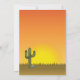 Ilustración original de Destei de un adorable dinosaurio Triceratops de color marrón parado en un escenario desértico durante la puesta del sol. Hay algunas rocas, un cactus y una planta en la escena. La hierba está seca y representada en color marrón. El sol se está poniendo justo detrás del dinosaurio creando un tono rojizo anaranjado para el cielo. Personalice las áreas de texto de muestra con los detalles de su fiesta.