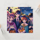 Invitaciones de fiesta de Halloween para el fiesta de niños. Pequeño truco o tratar a niños lindos de anime con disfraces con calabazas llenas de dulces.