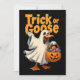 Funny Halloween goose in a spooky ghost costume with a pumpkin bucket full of candy. Perfect for humor-loving fans of Halloween and mischievous birds.