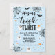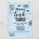 Trick or three! A perfect blend of blue, white, and black, with cute ghost motifs for a Spooktacular 3rd Birthday. This invitation sets the tone for a charmingly spooky celebration that's all about our little one's big milestone. The playful design captures the essence of Halloween while adding a touch of adorable to the festivities. Get ready to invite friends and family to a memorable day filled with smiles, costumes, and delightful surprises.