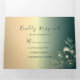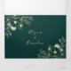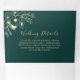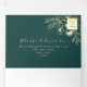 Sencilla, elegante, moderna invitación triple de boda en verde esmeralda, con flores art déco doradas e imagen de la pareja.