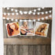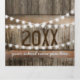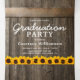 Una invitación a tres bandas de una fiesta de graduación de 2 en 1 rústico país con un fondo rústico de barril de madera, luces de cuerda brillante, girasoles amarillos brillantes, fotos del graduado, el año de clase, detalles de la celebración de graduación, y una postal rsvp para que sus invitados corten y envíen de vuelta.