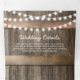 Una invitación de 3 en 1 triplicidad rústica de boda rural con fondo rústico de barril de madera, luces de cuerda, girasoles amarillos brillantes, tu monograma, detalles bodas, invitación a la boda y una postal rsvp para que tus invitados corten y envíen de vuelta.