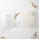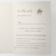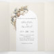 Experimente la belleza de su próxima celebración con esta invitación a la boda triple. El interior se despliega para revelar un tranquilo arco blanco de boho adornado con un rústico algodón de color acuático y eucalipto, con un suave fondo beige que crea un ambiente de elegancia natural. La solapa frontal presenta una cautivadora cortina acuarela no simétrica, personalizada con los nombres de la novia y el novio, que prepara el escenario para su día especial.